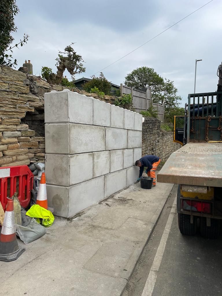 For high walls or sloped sites, we use geogrid mesh or steel reinforcements that anchor the wall into the soil and resist shifting.