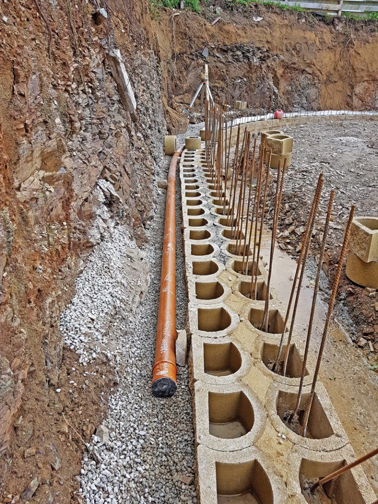 We install filter fabric and drainage pipes behind the wall to prevent water buildup, a common cause of wall failure in wet or freezing conditions.